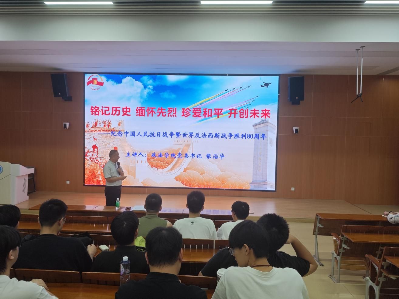 10月11日,政法学院党委书记张滔华以“铭记历史、缅怀先烈、珍爱和平、开创未来”为主题,为2023级、2024级行政管理专业学生讲授“思政第一课”,纪念中国人民抗日战争暨世界反法西斯战争胜利80周年。课程结合历史事实,系统讲述抗日战争的光辉历程及其在世界反法西斯战争中的重要贡献,并组织学习习近平总书记相关重要讲话精神。张书记还分享了本校学生王可心作为女民兵参加抗战胜利80周年阅兵的荣誉。他指出,此次阅兵展现了人民军队崭新形象,...