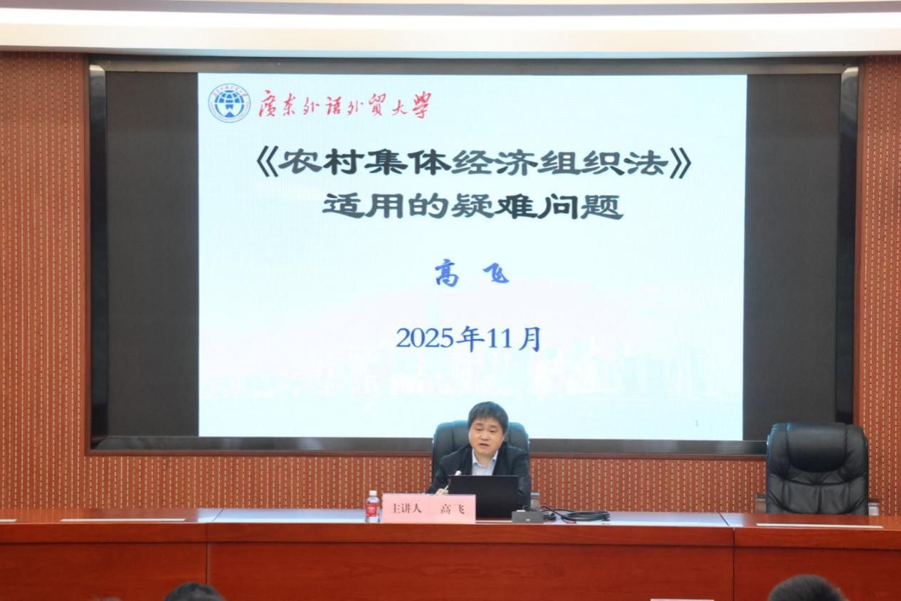 “三农”问题事关国计民生与国家长远发展,始终是我国现代化建设的重要议题。为增进师生对“三农”领域前沿热点问题的认识,2025年11月19日晚,我院特邀广东外语外贸大学土地法制研究院院长高飞教授,作题为“《农村集体经济组织法》适用的疑难问题”的专题讲座。本次讲座由院长许英教授主持,全院共计 140 余名师生现场参与学习。