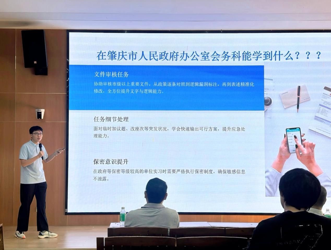 在实习生代表分享环节,莫经伦、郭小雁等8位同学依次发言。他们分别来自政府机关、事业单位等不同类型的实习单位,围绕基层治理、行政实务、部门职能等主题分享了实践心得。代表们的发言既有理论思考,又有实践感悟,为师生呈现了生动的实践教学案例。