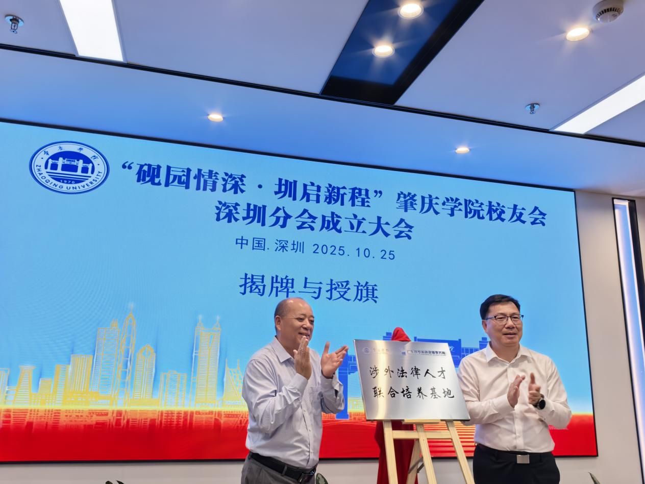 2025年10月25日,“砚园情深·圳启新程”肇庆学院校友会深圳分会成立大会在深圳举行。在成立仪式上,肇庆学院党委书记谢冠华和广东普罗米修律师事务所全国总所管委会主任梁江洲共同为涉外法律人才联合培养基地揭牌,这标志着我校涉外法治人才培养迈出新的步伐。