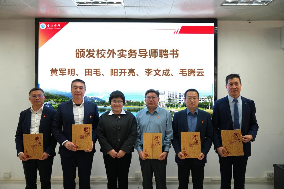 在实务导师聘任仪式上,许英院长为广东普罗米修律师事务所黄军明、田毛、阳开亮、李文成、毛腾云五位资深律师颁发校外实务导师聘书。此次集中聘任是我院涉外法治人才培养体系建设的关键举措,通过引进资深实务专家,构建“双师型”教学团队,促进理论教学与法律实践的深度融合,为涉外法治人才培养注入强有力的师资动能。