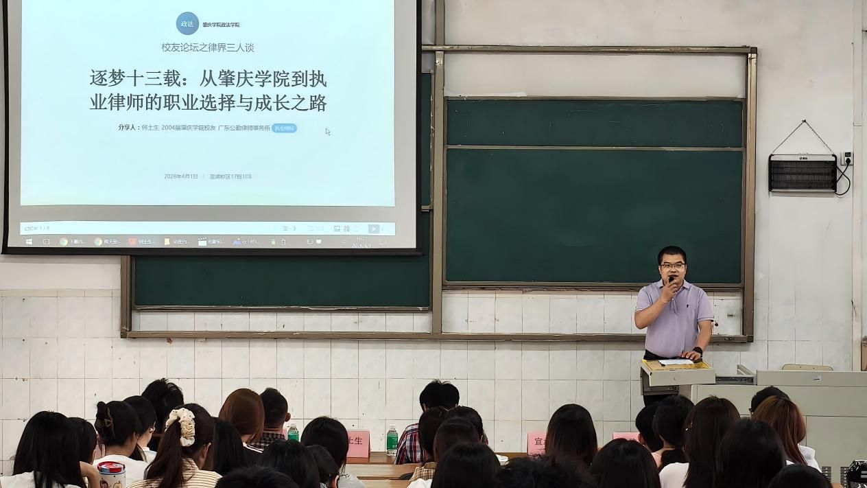 论坛现场,2004届校友、广东公勤律师事务所执业律师何土生,首先回顾了自身从职场起步到深耕律界的转型历程,结合七年一线执业积累的实战经验,为同学们提出了“先就业、后择业”的务实建议。他强调,职业规划不必追求“一步到位”,需兼顾短期现实需求与长期理想追求,每一段职场经历、每一次实践积累,都是未来职业发展路上不可或缺的宝贵财富。谈及法考备考这一核心话题时,他勉励同学们,法考之路没有捷径,唯有坚守初心、脚踏实地、攻坚克难,才能突破瓶颈、收获成功。