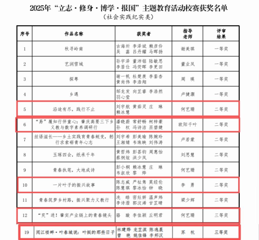 近日,肇庆学院2025年“立志·修身·博学·报国”主题教育系列活动校级选拔赛获奖名单正式公布。我院学子凭借扎实的实践能力、鲜活的现实观察与思考,在比赛中表现优异,共有刘宇航、严祉隽、陈志威、莫经伦、陈慧琪、廖思怡、黎冰怡、钟晓、龙芷琪、朱亮星、李佳棋、朱冰玲、李佳颖、孙权、翁晓钿、李子婕、陈燕云、关宇航、韩瑞十九位同学荣获表彰。