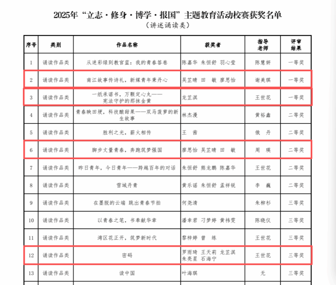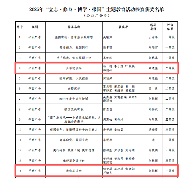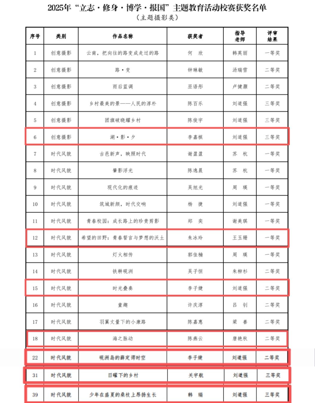 本次赛事根据《广东省教育厅关于开展2025年“立志·修身·博学·报国”主题教育系列活动的通知》精神,设置社会实践纪实类、讲述诵读类、歌曲传唱类、主题摄影类、公益广告类、舞台剧目类、教育微课类等多个类别。我校广泛动员、积极参与,涌现出一批优秀的校园文化作品。